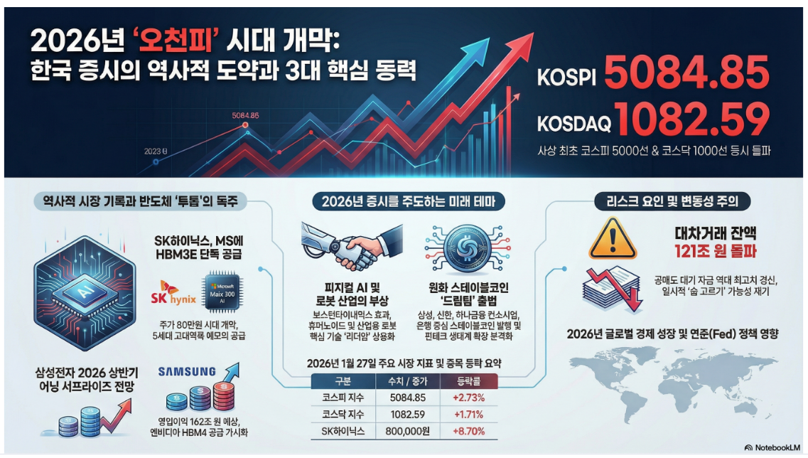1월 27일 코스피는 전일 대비 2.73% 급등한 5,084.85를 기록하며 사상 처음으로 종가 기준 5,000선을 돌파했습니다.