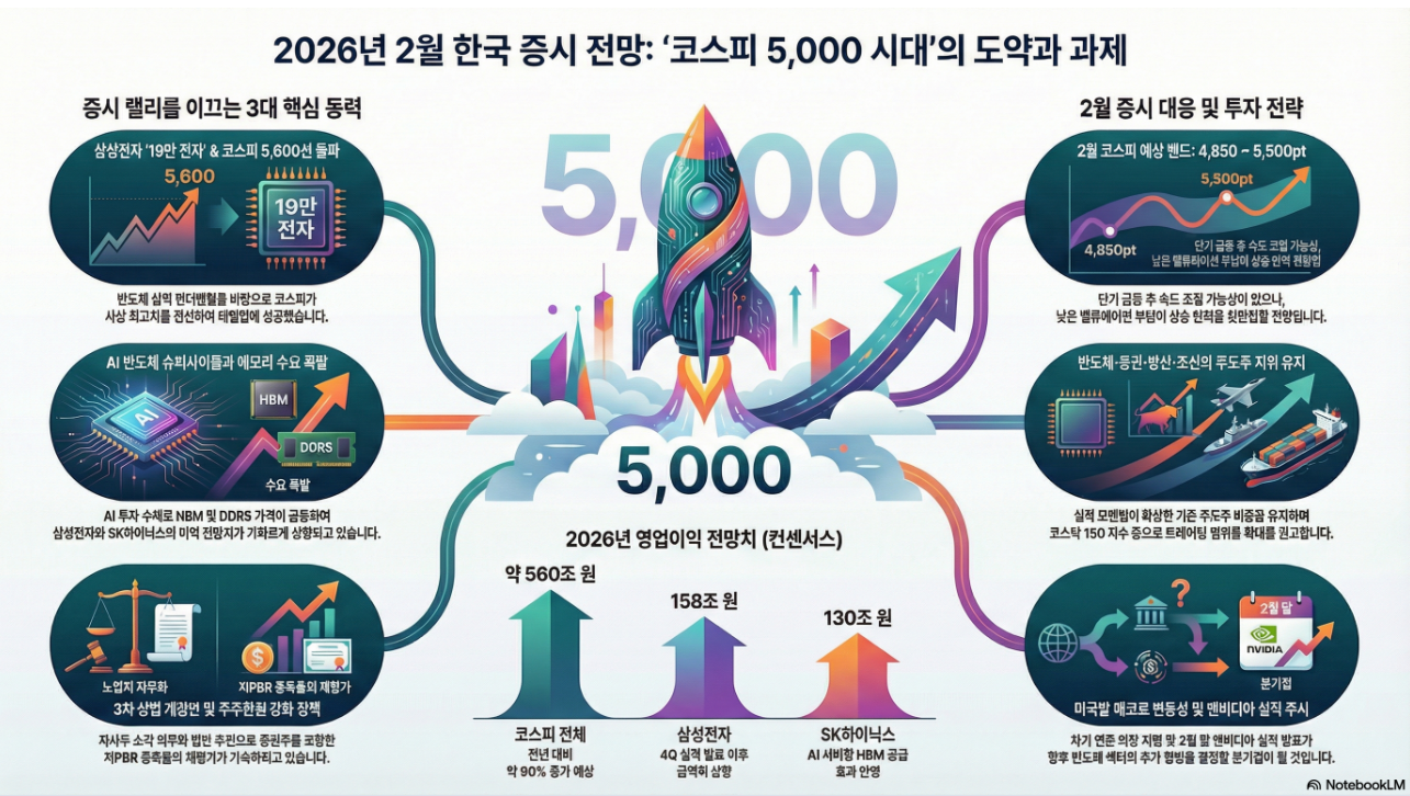 삼성전자의 '19만 전자' 안착과 상법 개정안 훈풍에 힘입어 코스피 5,600 시대가 열렸으나, 미국발 '이란 전면전' 리스크와 PCE 물가 지표 발표를 앞두고 고점에서의 변동성 관리가 필요한 시점입니다.